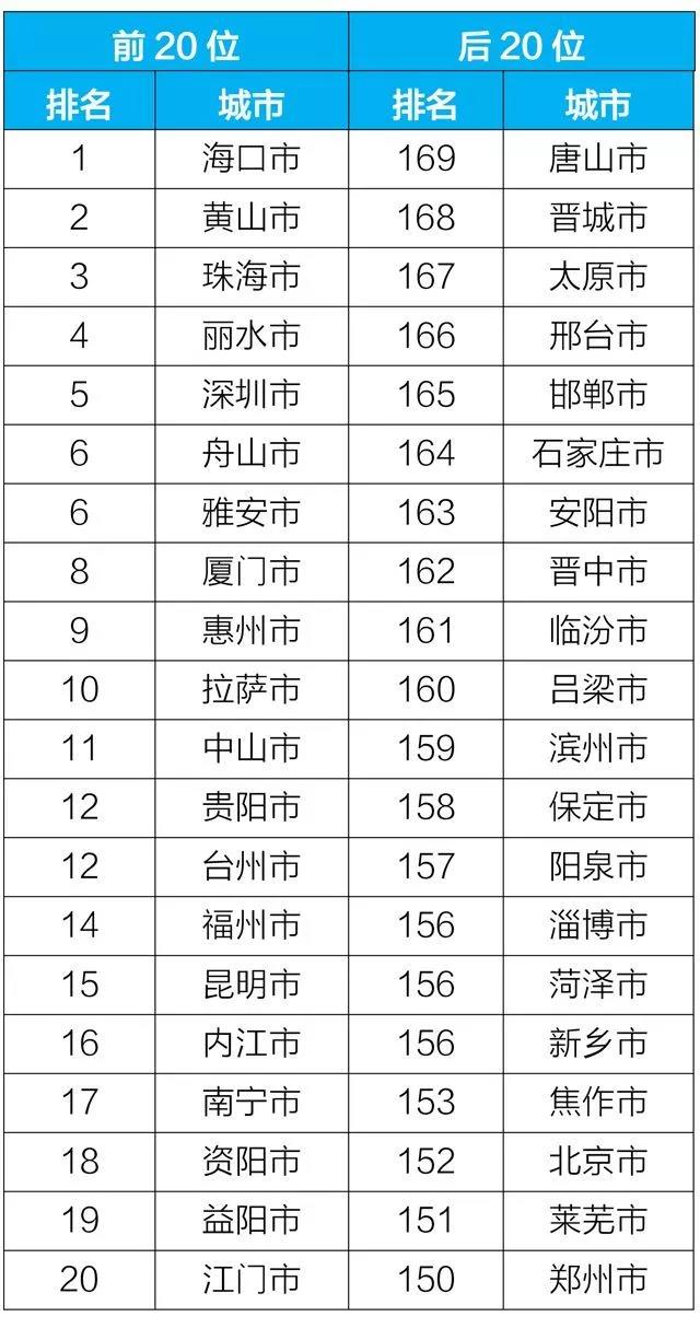 2018年6月,169城市中唐山、晉城、太原等20個城市空氣質(zhì)量相對較差(從第169名到第150名);???、黃山、珠海等20個城市空氣質(zhì)量相對較好(從第1名到第20名,見附表1)。